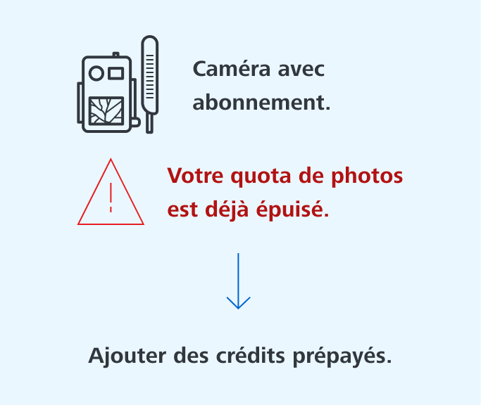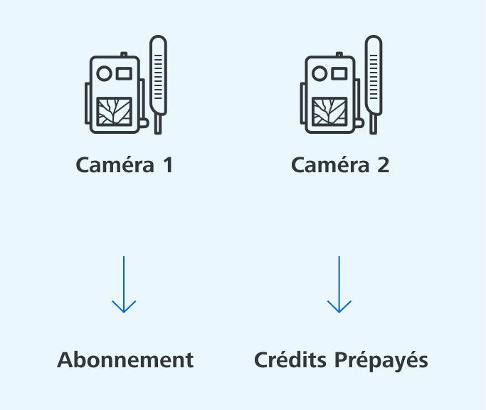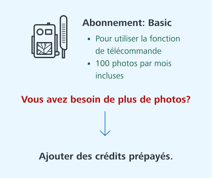 | Particulièrement avantageux en cas d’utilisation régulière ou avec plusieurs caméras | Vous payez à chaque photo ou vidéo envoyée |